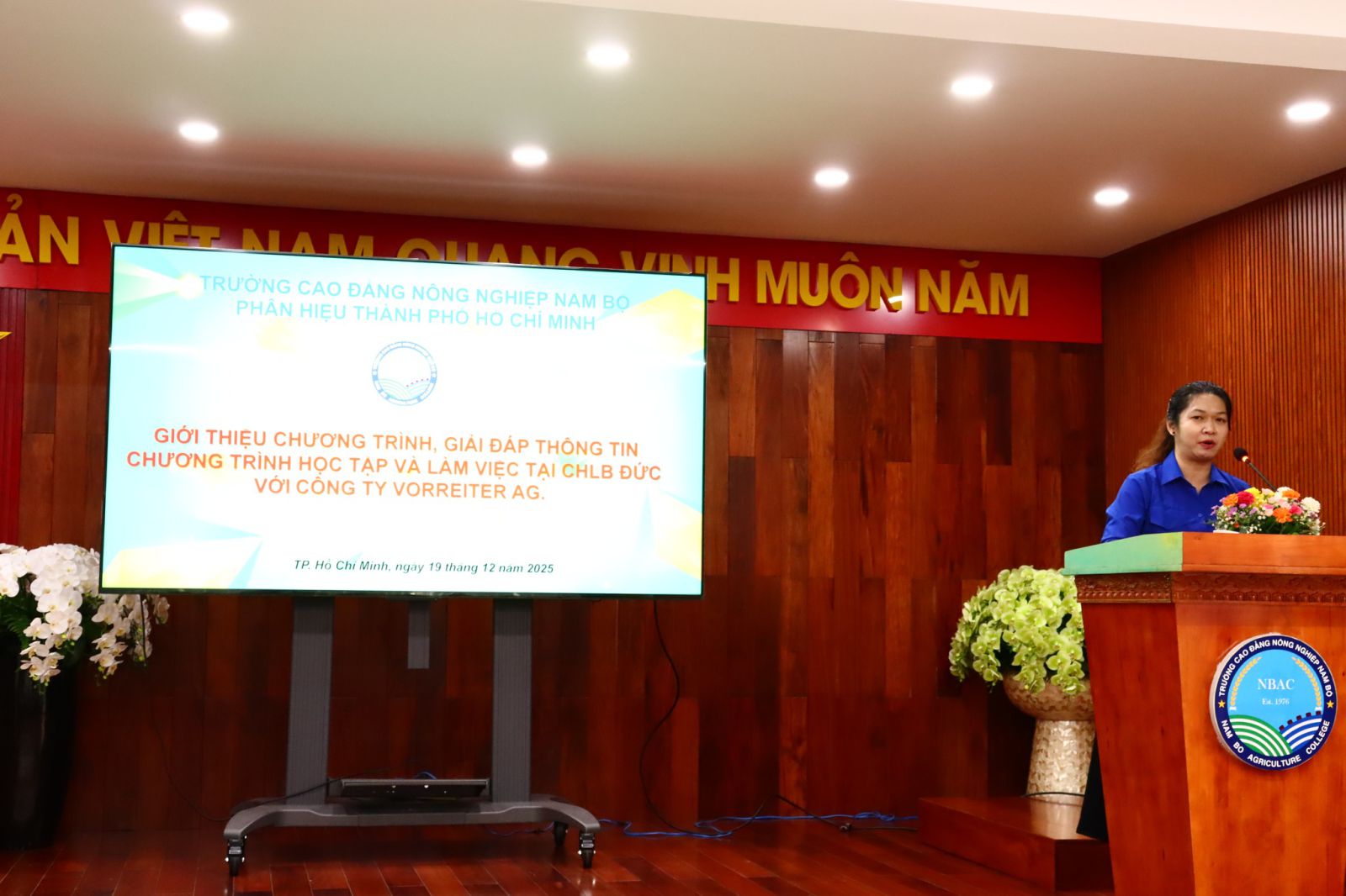 Vào chiều hôm qua (19/12/2025), Phân hiệu Trường Cao đẳng Nông nghiệp Nam Bộ tại Thành phố Hồ Chí Minh đã phối hợp cùng Công ty Vorreiter AG (CHLB Đức) tổ chức chương trình giới thiệu và giải đáp thông tin về học tập, làm việc tại Cộng hòa Liên bang Đức dành cho HSSV.